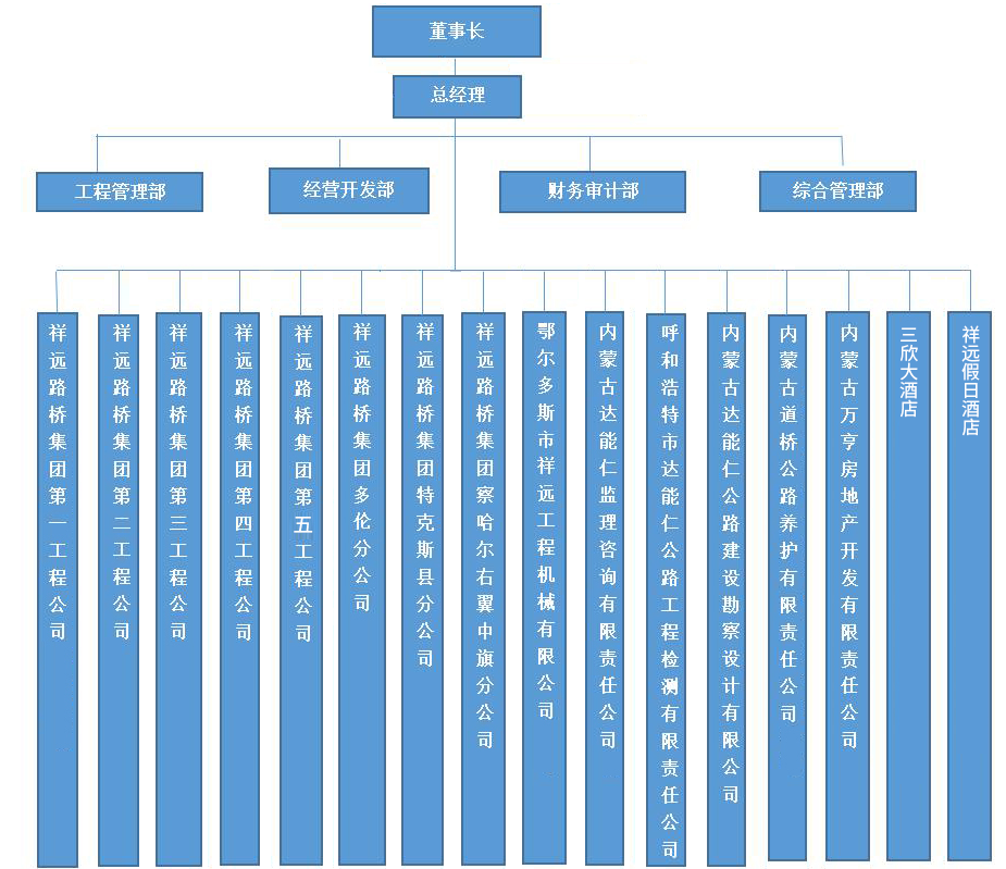 公司成立發(fā)展至今,下設八個分公司,分別為第一工程公司、第二工程公司、第三工程公司、第四工程公司、第五工程公司、祥遠路橋集團多倫分公司、、祥遠路橋集團特克斯縣分公司、祥遠路橋集團察哈爾右翼中旗分公司;一個全資子公司:內蒙古萬亨房地產開發(fā)有限責任公司;五個控股子公司,分別為鄂爾多斯市祥遠工程機械有限公司、內蒙古達能仁監(jiān)理咨詢有限責任公司、呼和浩特市達能仁公路工程檢測有限責任公司、內蒙古道橋公路養(yǎng)護有限責任公司、內蒙古達能仁公路建設勘察設計有限公司;兩個酒店:三欣大酒店、祥遠假日酒店。目前集團公司下設四個職能部門,分別是:綜合管理部、財務審計部、工程管理部、經營開發(fā)部。各部門密切配合、通力協作,打造出一支精干高效,富有戰(zhàn)斗力的團隊。